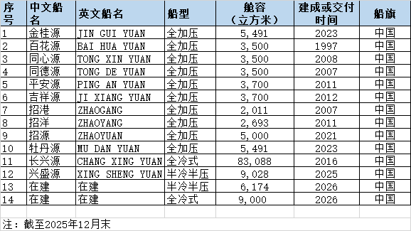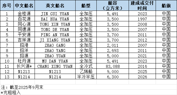 | 序号 | 中文船名 | 英文船名 | 船型 | 舱容 (立方米) | 建成或交付时间 | 船旗 |