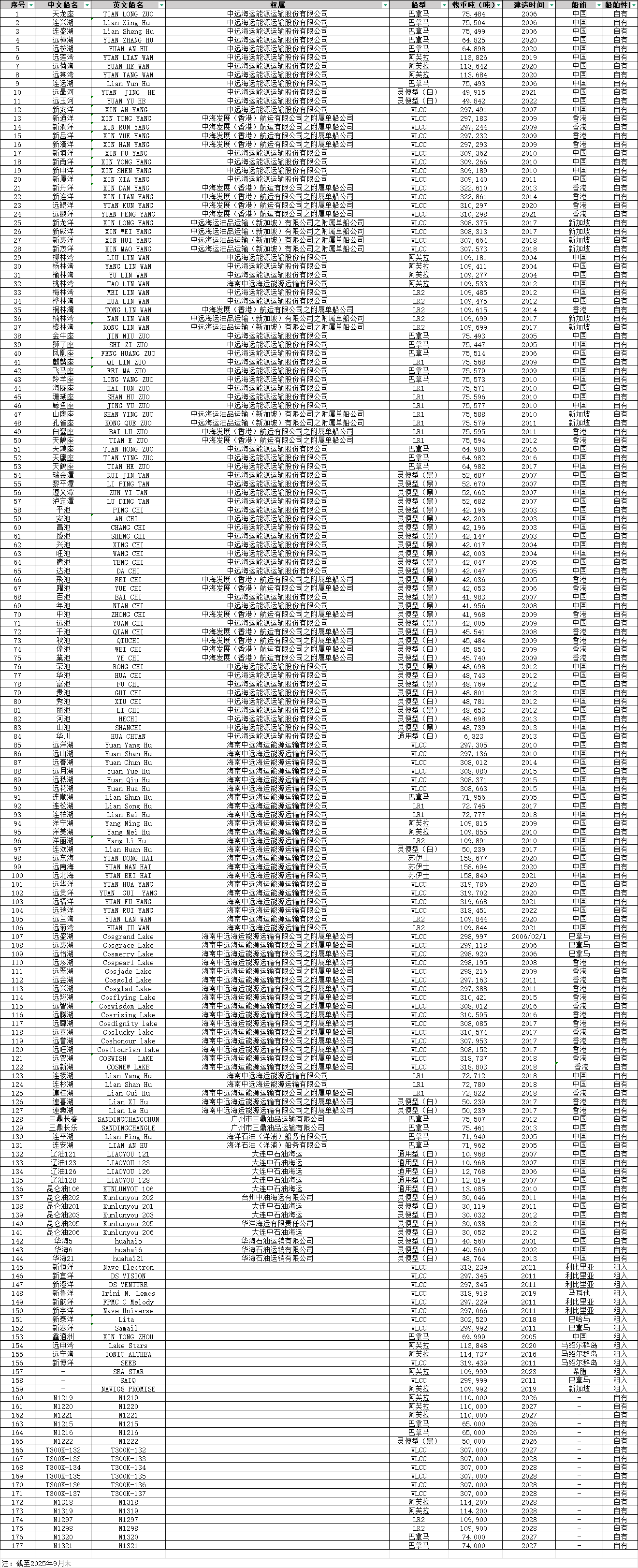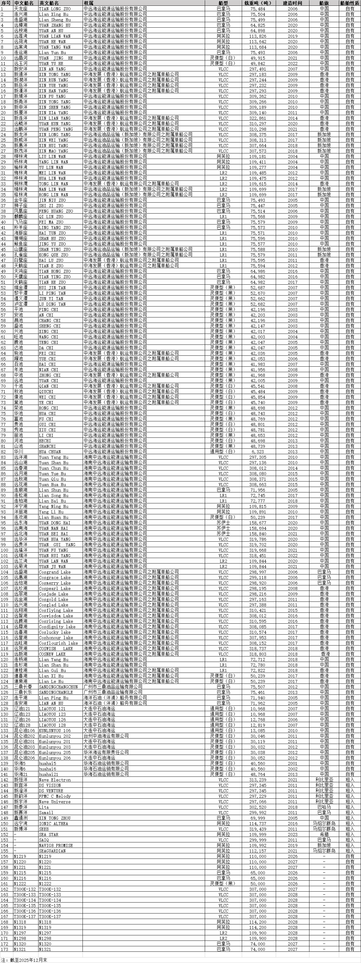 | 1 | 驭能鲲鹏 | YU NENG KUN PENG | 中远海运能源运输股份有限公司 | 巴拿马 | 64,900 | 2026年 | 中国 | 自有 |
