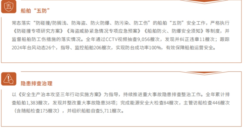 安全是航运业的基石,更是中远海运能源的立身之本。公司将安全置于最高优先级,持续完善安全管理体系,强化安全风险防控,并通过文化培育全面提升员工的安全意识与能力。凭借卓越的安全管理水平,为全球能源运输保驾护航。